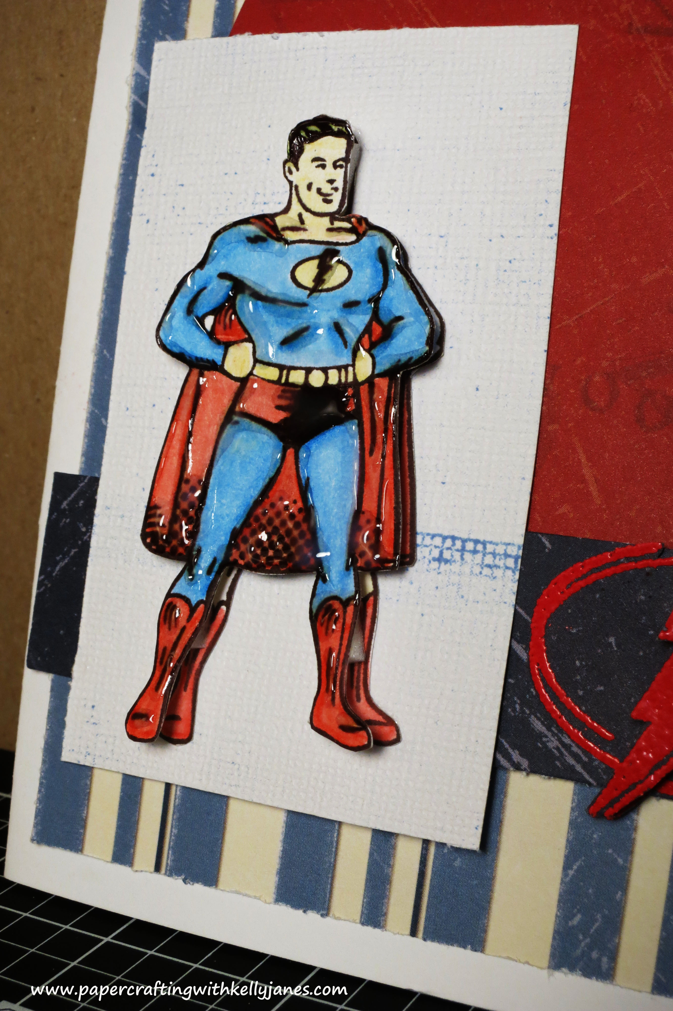 I stamped the superhero image twice, colored both images with Watercolor Pencils, and used a blending pen to help the colors have more continuity. I then used pop dots to give the image some dimension. Using Liquid Glass I went back over the shadowed areas of the stamp to give it more of an epoxy look.