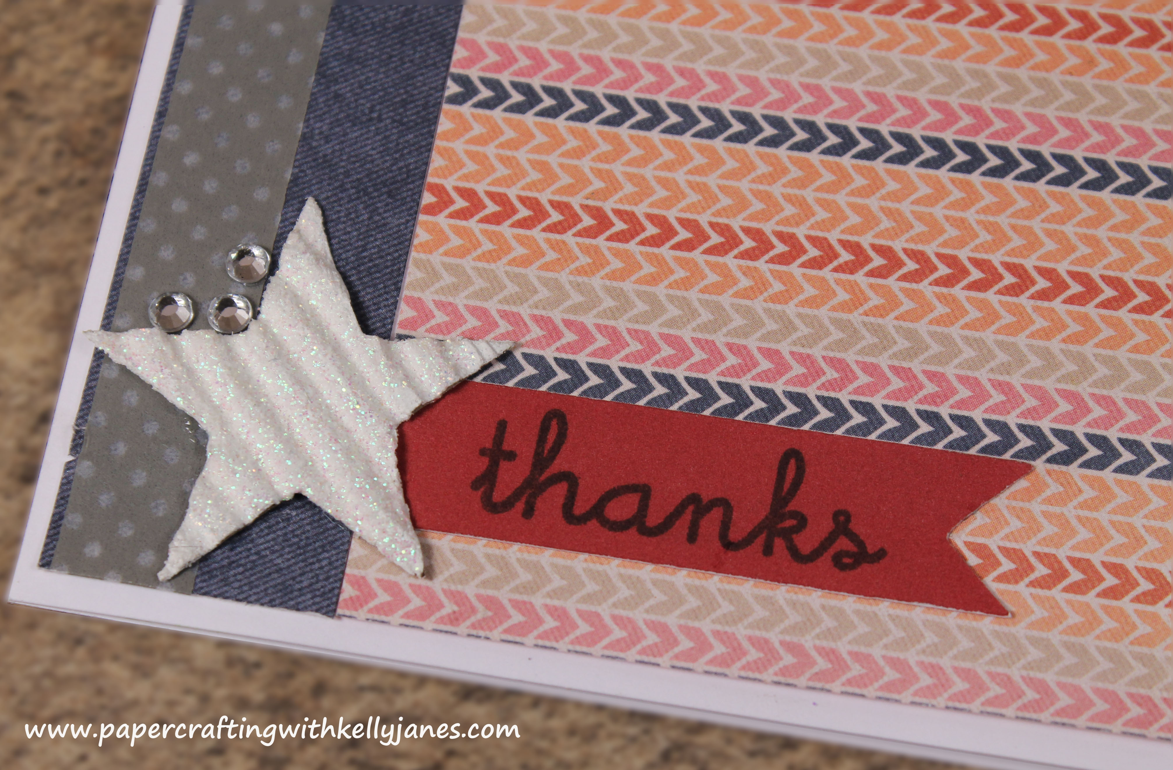 Using B&T Duos from the Claire Paper Packet* and Slate Polka Dot Washi Tape I created the background of the card. Adding the banner cut with the Art Philosophy Cricut® Cartridge in Ruby Cardstock and stamped with a coordinating stamp set sentiment in Outdoor Denim Exclusive Ink®. Along with a corrugated chipboard star* covered in white acrylic paint with a sprinkle of Prisma Glitter and a little extra added bling from the Sparkles Clear Assortment to make the card complete.