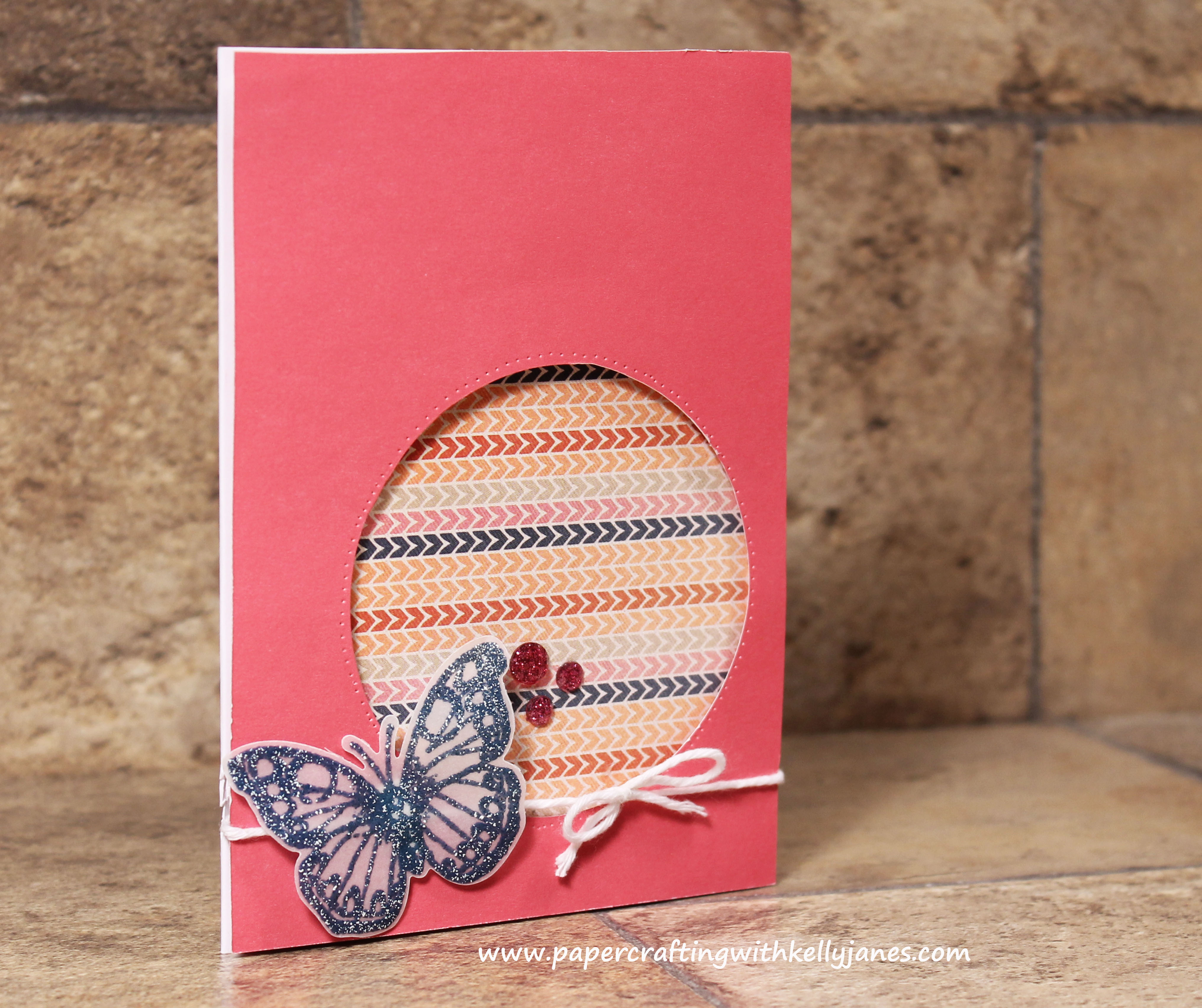 The butterfly is stamped and cut using a Sizzix Stamp and Die combo on vellum paper, and heat embossed using Versamark and Stampendous embossing powder.