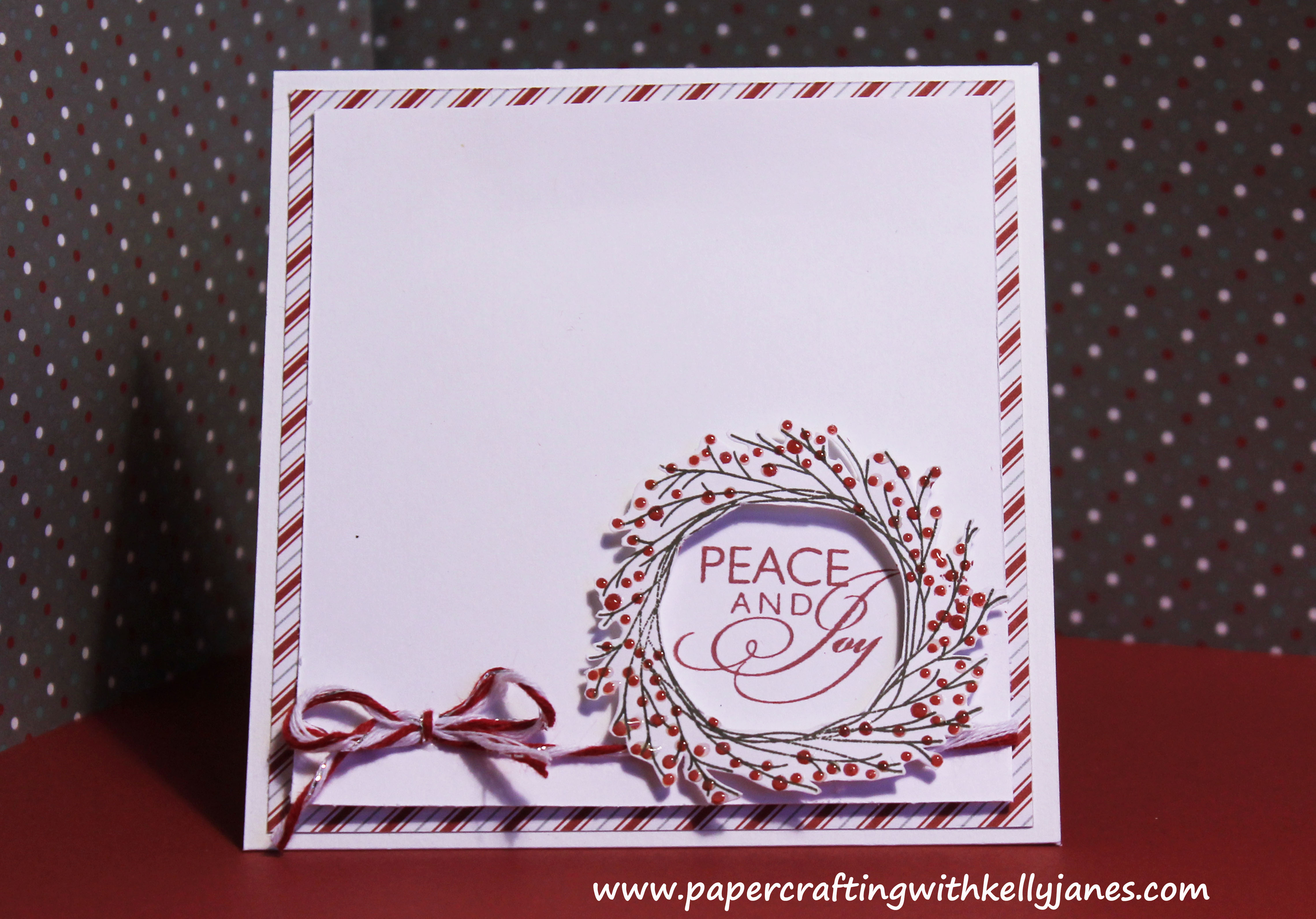 I “fussy cut” the stamped image and adhered it to the card with 3D Foam Tape. I also added Liquid Glass to the berries on the wreath to give the card a bit of shine. The sentiment is also stamped in Ruby Exclusive Ink® using the stamp set from the Workshop On The Go® Frosted Cardmaking Kit.  This fabulous Baker’s Twine is from the Mini-Medley Accents Ruby Collection. I love that shimmer of silver that is braided into the twine!!