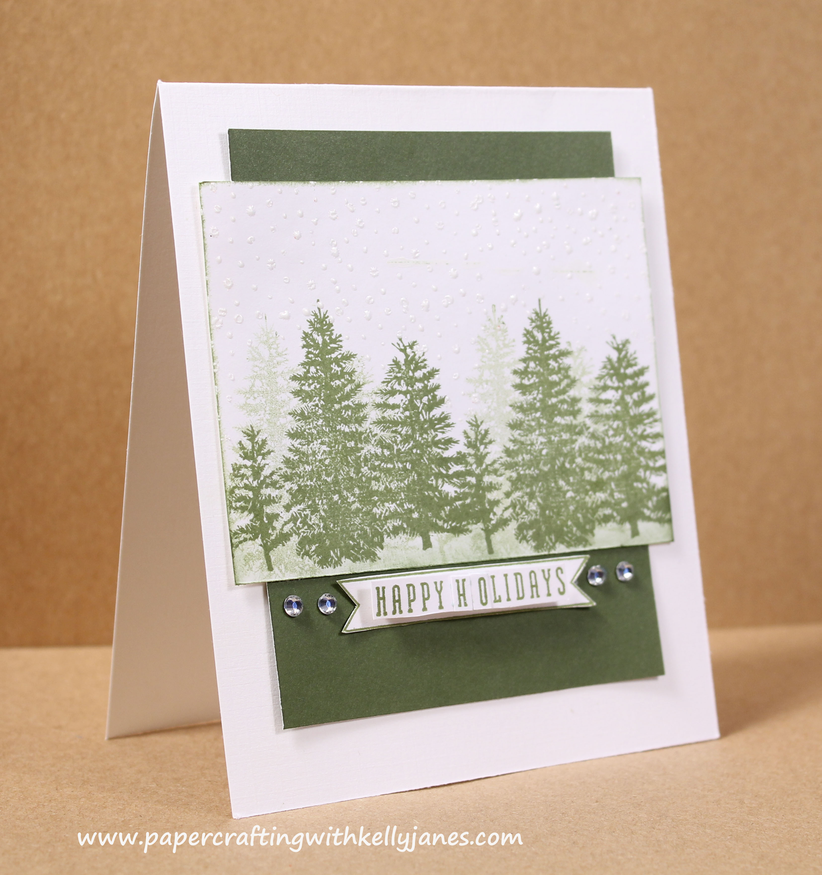 And as you can see above the stamp set includes an adorable owl image and the sentiment reads, “Happy Owlidays”. Because I didn’t use an owl on this card the sentiment wouldn’t have made much sense, so I cut out an individual “H” and “O” to make the sentiment what I needed it to be. I added 3D Foam Tape behind the sentiment for it to pop off my card.  I also added 4 sparkles from the Clear Sparkle Assortment Pack.