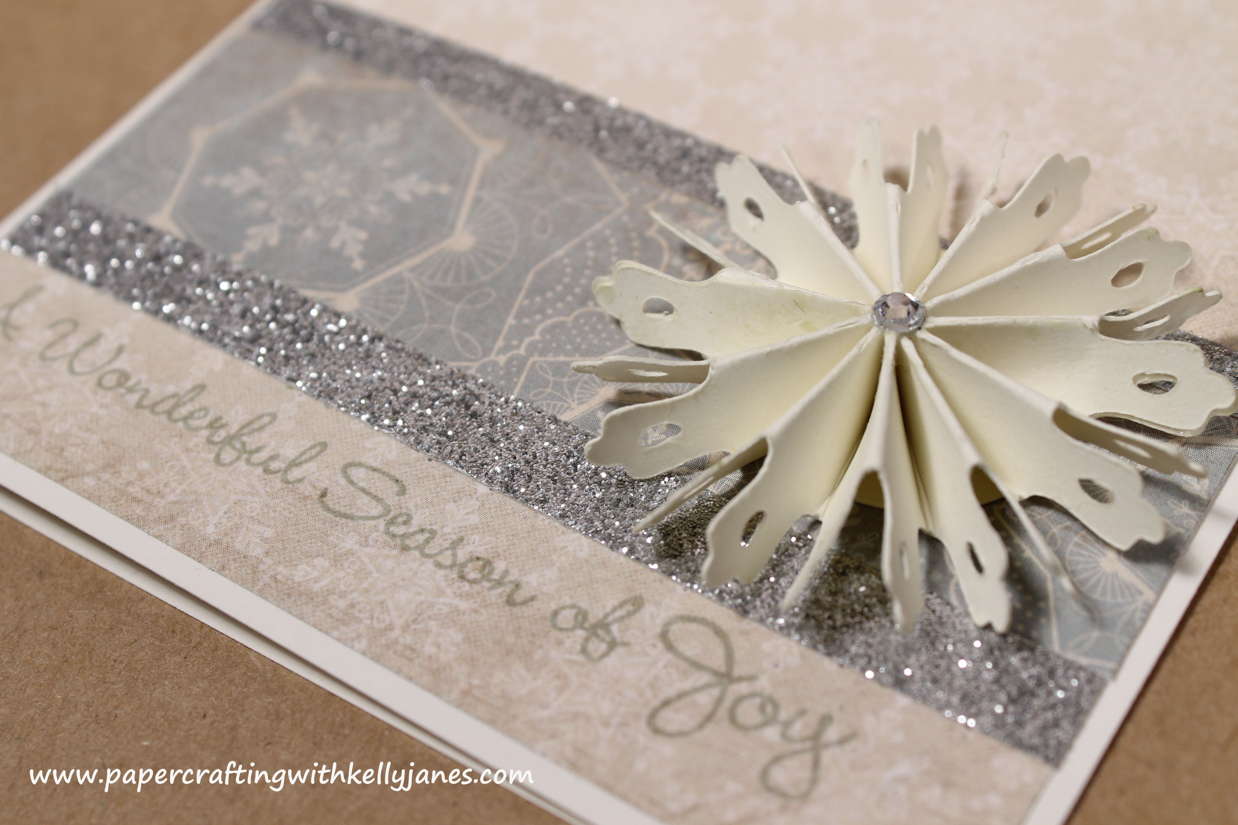 I love rosettes!! I especially love the look of this rosette which was cut from the Artiste Cricut® Cartridge on Colonial White Cardstock. It reminds me so much of a snowflake which fits my theme perfectly! I used Liquid Glass to adhere the rosette together, and also to secure my Clear Sparkle to the center.