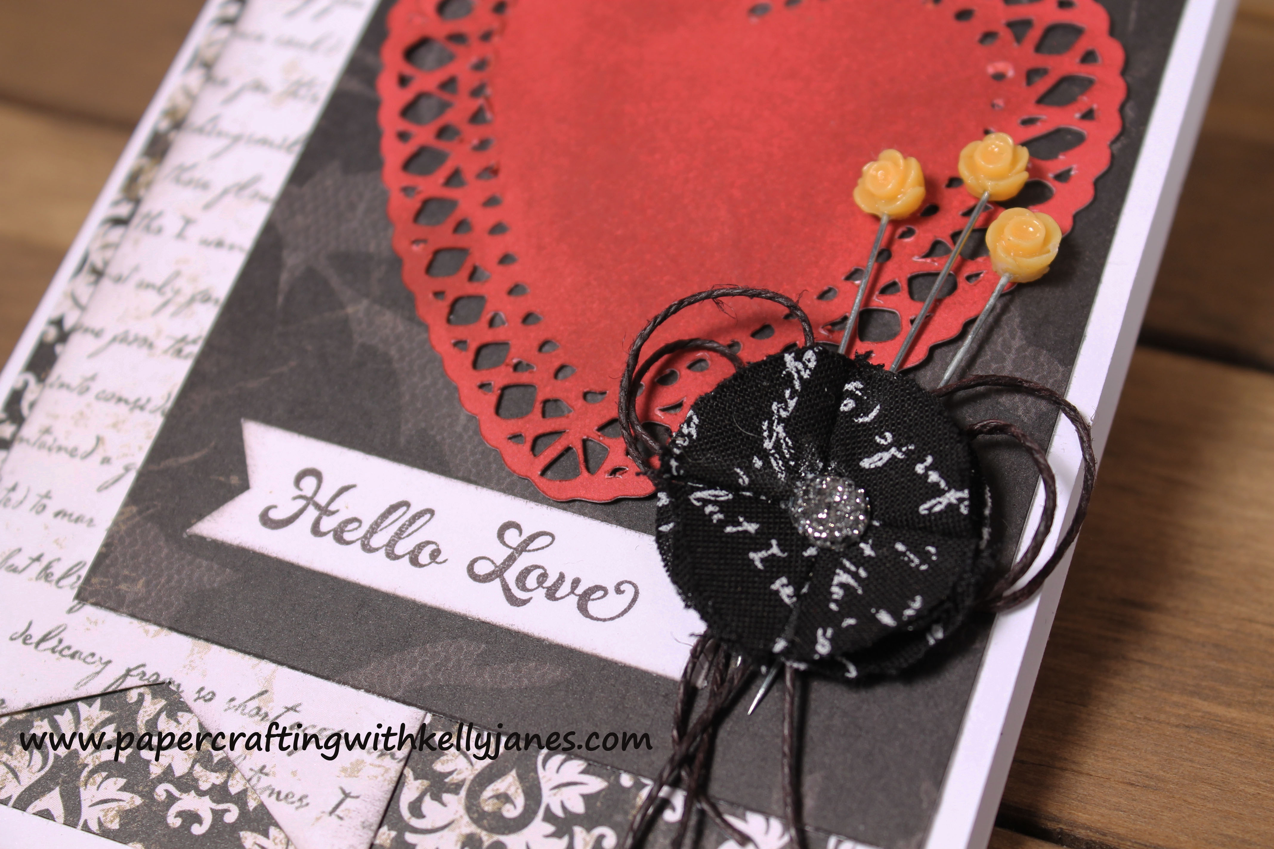 Using B&T Duos from the For Always Paper Packet* I created the background of this card. The doily heart is cut using the Art Philosophy Cricut® Cartridge in Ruby Cardstock and is distressed using a sponge dauber and Ruby Exclusive Ink®. The flower is made by folding the For Always Textiles onto an Base & Bling Adhesive Dot. The center gem can be purchased in the Base & Bling Black Jewels assortment and the stick pins are from the For Always Assortment*. To give the card added dimension I also added a couple layers of Black Hemp* behind the fabric flower. The sentiment, stamped in Black Exclusive Ink®, is from the Photogenic Stamp Set that was available during the Holidays From The Heart Campaign {October-December 2013}. I also used a sponge dauber and Black Exclusive Ink® to distress the edges of the White Daisy Cardstock and the white text printed B&T Duo®.