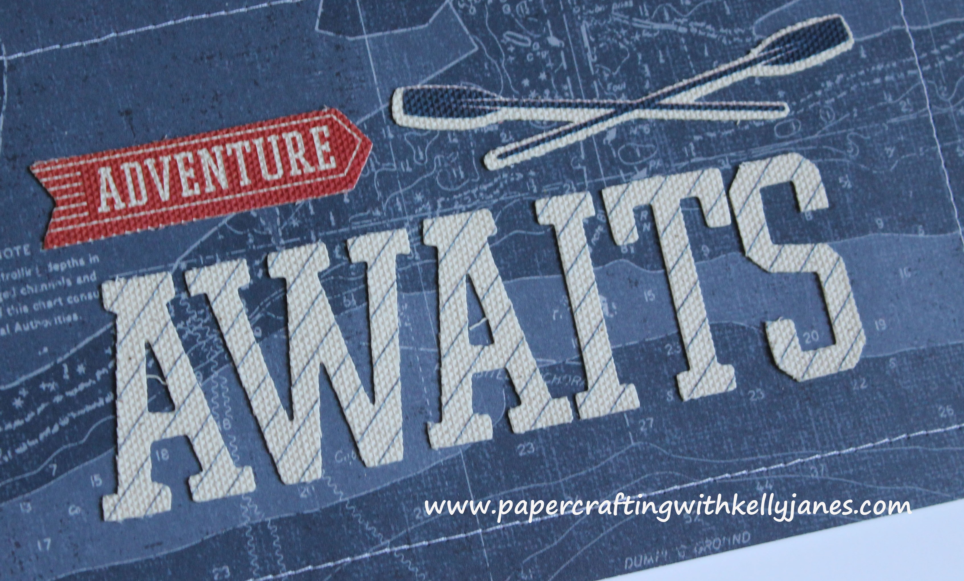 Onto the embellishments…..I layered a couple tags from K & Company, using a sponge dauber and Outdoor Denim Exclusive Ink™ to define the edges of the tag. The title and little birdies come from the Tommy Complements*, and the pennants are from the Tommy Assortment*. The subtitle towards the top of the page was created using the Keyboard Uppercase Stamp Set and Outdoor Denim Exclusive Ink™.