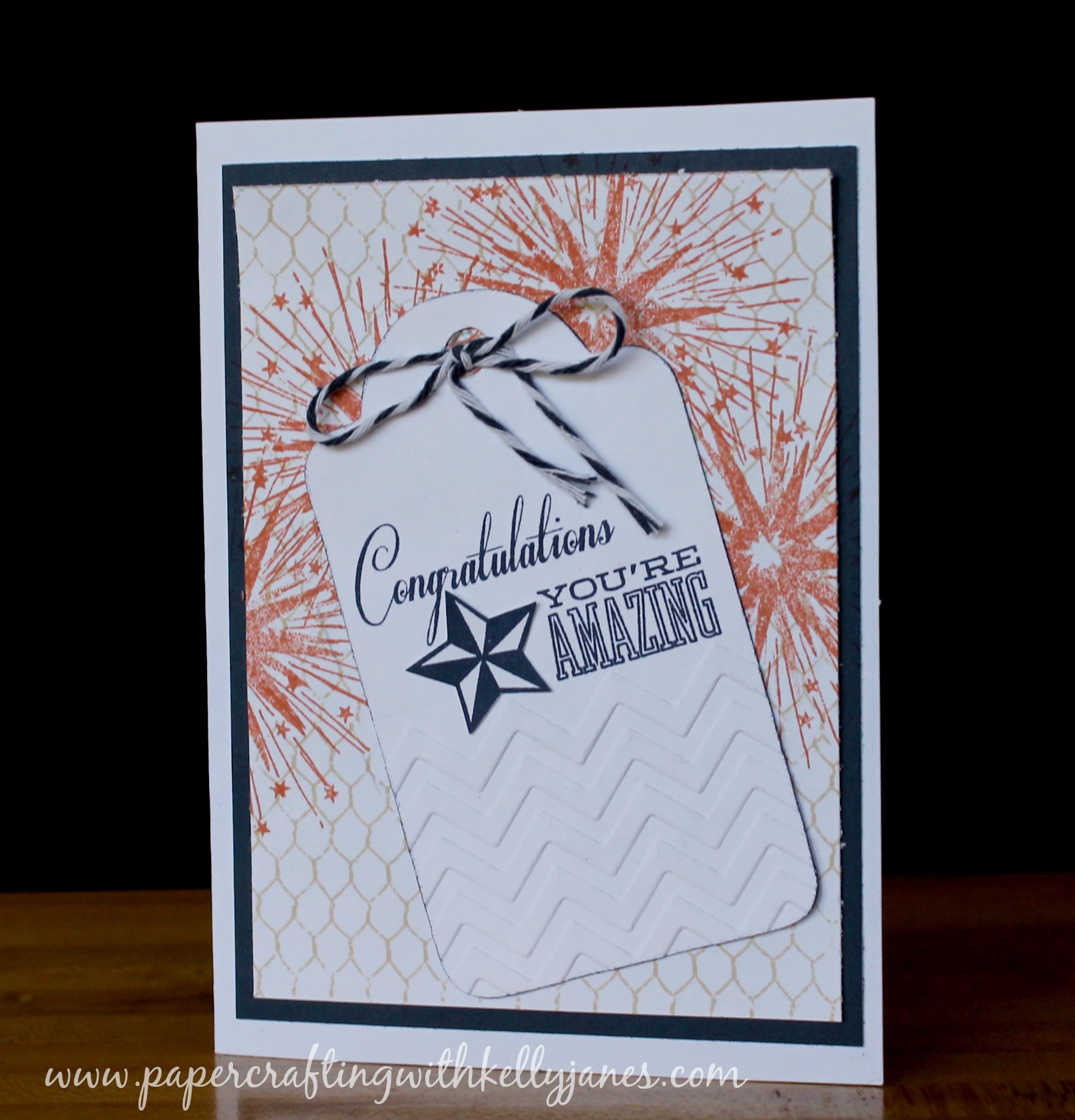Starting with a white card base, I added a layer of CTMH Outdoor Denim Cardstock followed by another layer of White Daisy Cardstock. On the top layer of cardstock I used the CTMH Distressed Backgrounds Stamp Set in Champagne Exclusive Ink™ followed by another firework image from June’s SOTM in Sorbet Exclusive Ink™. The tag was cut in White Daisy Cardstock using the Art Philosophy Cricut® Cartridge. I again used a sponge dauber and Outdoor Denim Exclusive Ink™ around the edges of the tag for more definition. The sentiments come from two different stamp sets; the “congratulations” sentiment and the star are from the Casual Expressions Stamp Set and the “you’re amazing” is from the Cricut® Artiste Collection. To give the tag a little texture I used the Chevron Embossing Folder and tied a bow using the Harvest Baker’s Twine at the top of the tag. {card inspired by this card by Lisa Henke}