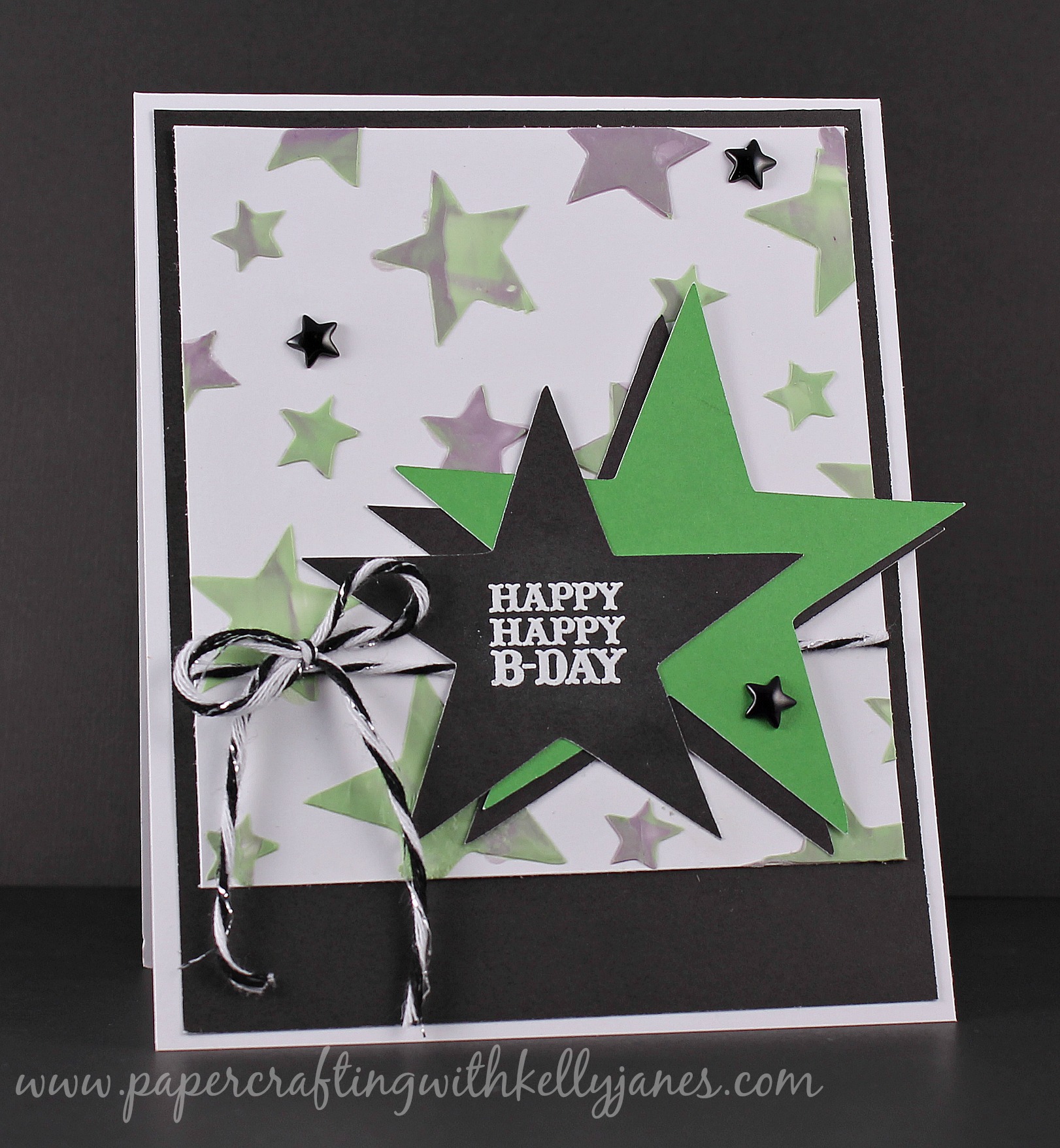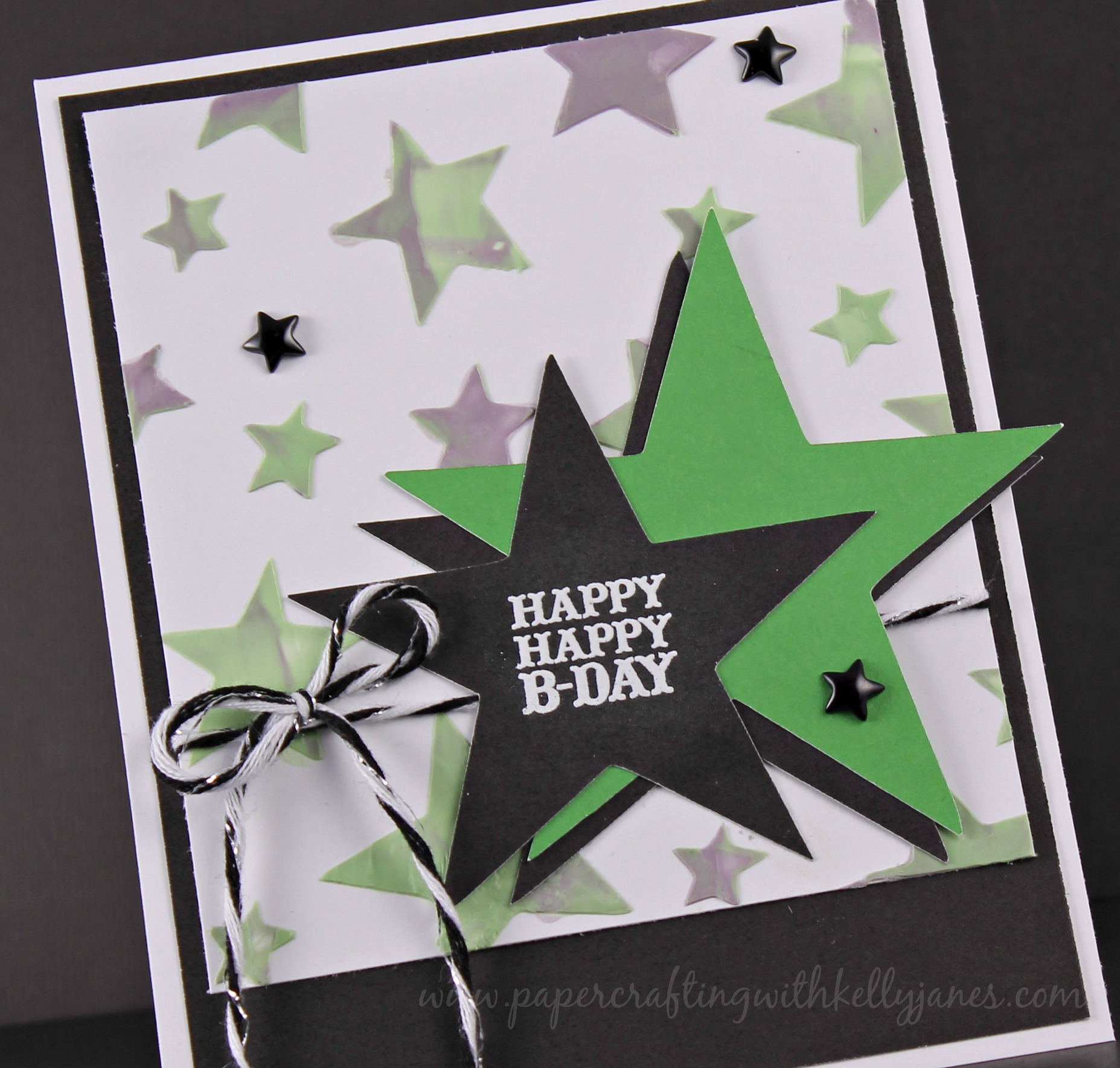 Once the modeling paste was dry {you can use a Craft Heater to speed this process up} I matted the the White Daisy Cardstock onto a layer of Black Cardstock. I cut multiple stars in Black Cardstock and Topiary Cardstock using the Art Philosophy Cricut® Cartridge. I tied a piece of Baker’s Twine onto the card and then layered the paper stars. On the top star I used Versamark™ Ink and White Embossing Powder with the Big Top Stamp Set for the sentiment. After I had all the layers down I added a few black resin stars that are available in the Scaredy Cat Assortment. I had planned on adding some white stitching around the black cardstock base, but I broke the needle on my sewing machine—BOO!! You can cry with me if you like!!