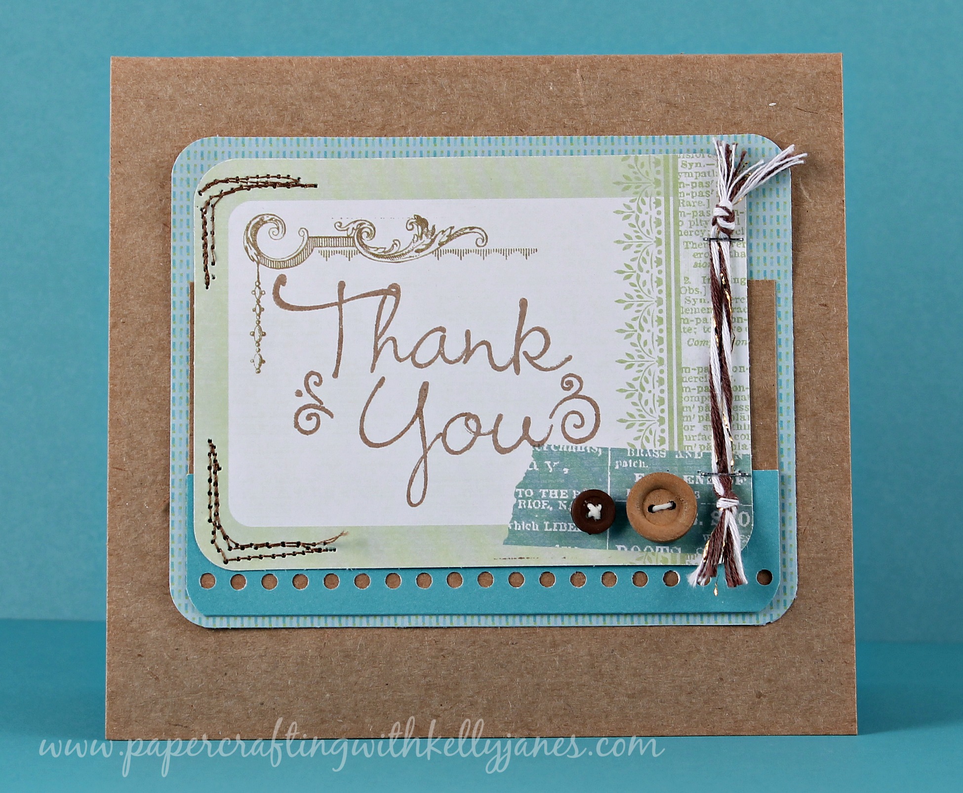 My card this week features another Picture My Life™ card!! I started with a Kraft Cardstock Base, followed by a Blossoms B&T Duo™. To add a little dimension and appeal to the card I added another small layer of kraft followed by a small scrap piece of Lagoon Cardstock. I used an American Crafts punch to create the border along the edge of the Lagoon Cardstock.