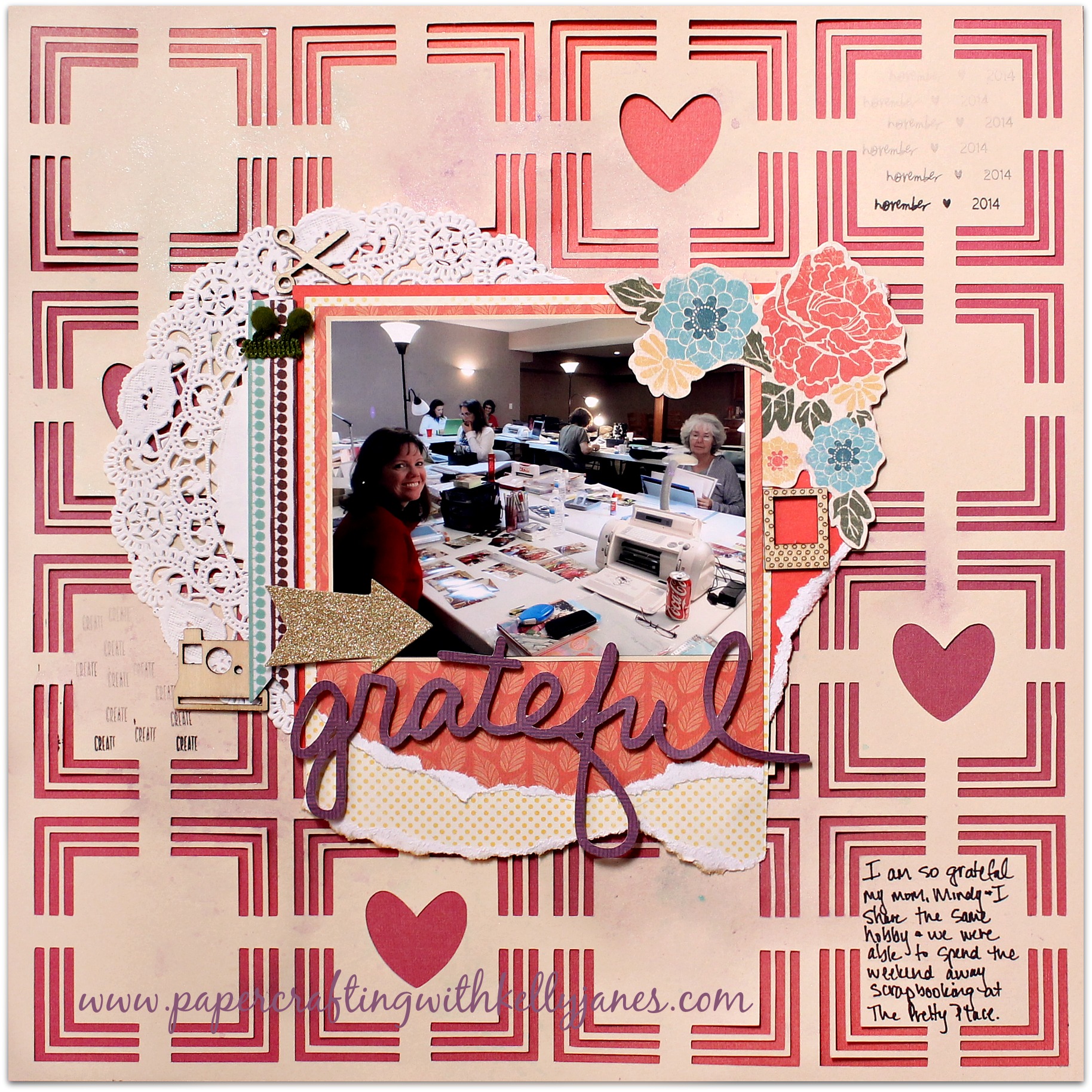 Now onto my photo cluster. It’s a combo of Sangria B&T Duos, some yellowish polka dotted paper that was in my stash, Champagne and Pomegranate Cardstock (both included in the Sangria Paper Packet). Once I had all of that together I started embellishing. I started by adding a doily behind the photo cluster. The flower cluster is a sticker from Indie Chic and the banner on the left of the photo is from Little Yellow Bicycle. The wood veneer pieces and gold glitter arrow were just a few things I had in my stash. The “Grateful” title, is cut on another piece of Sangria B&T, is a freebie cut file from Paper Issues and I used pop dots to add dimension to the title.