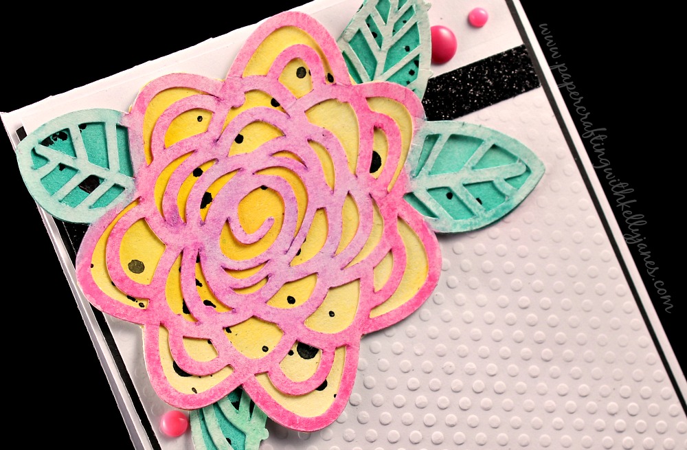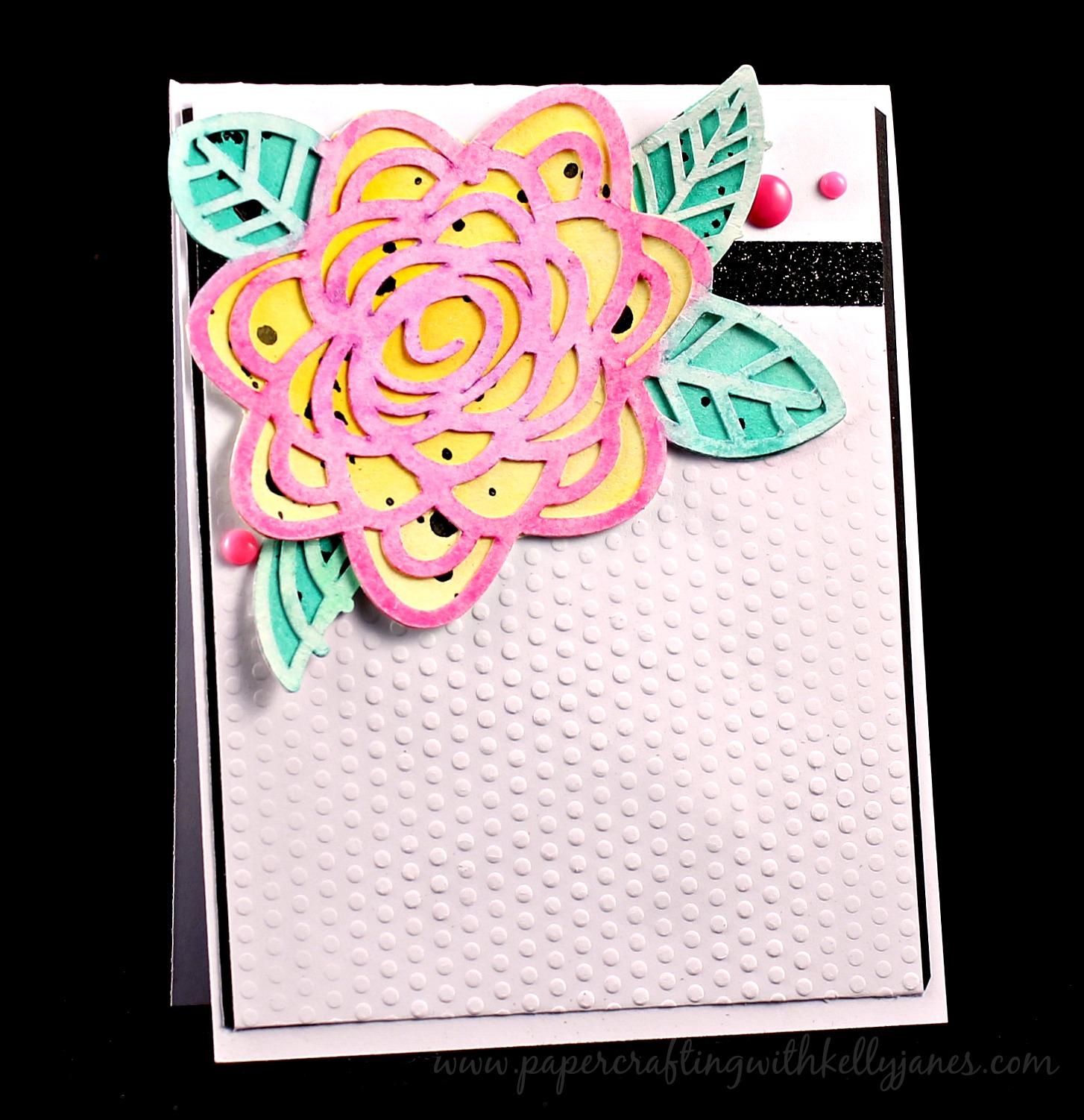 For my card I used a white cardstock base and then cut a panel for the front of the card using the same cardstock. My floral image is a little larger than shown on the sketch and I shifted it to the left side of the card. The flower image is a cut file from The Cut Shoppe on watercolor paper. Before I removed the paper from my Cricut® cutting mat I used watercolor paints to color the floral image and leaves. I set it aside to let it dry and grabbed the white cardstock panel to run the lower half of the cardstock panel through my Big Shot using a Lifestyle Crafts dry embossing folder. I planned on using patterned paper to back the die cuts but couldn’t find anything in my stash I liked. So I grabbed my watercolor paper and created a backdrop for my flowers. I wanted to add a little bit of black to help the floral image pop so I added a couple strips of black cardstock along the white cardstock panel and also a strip of Black Shimmer Trim under the die cut. I also wanted another pop of color so I added in a few CTMH Pink Flamingo Dots. I’ll add a sentiment to the inside of the card when the occasion arises to send it out!