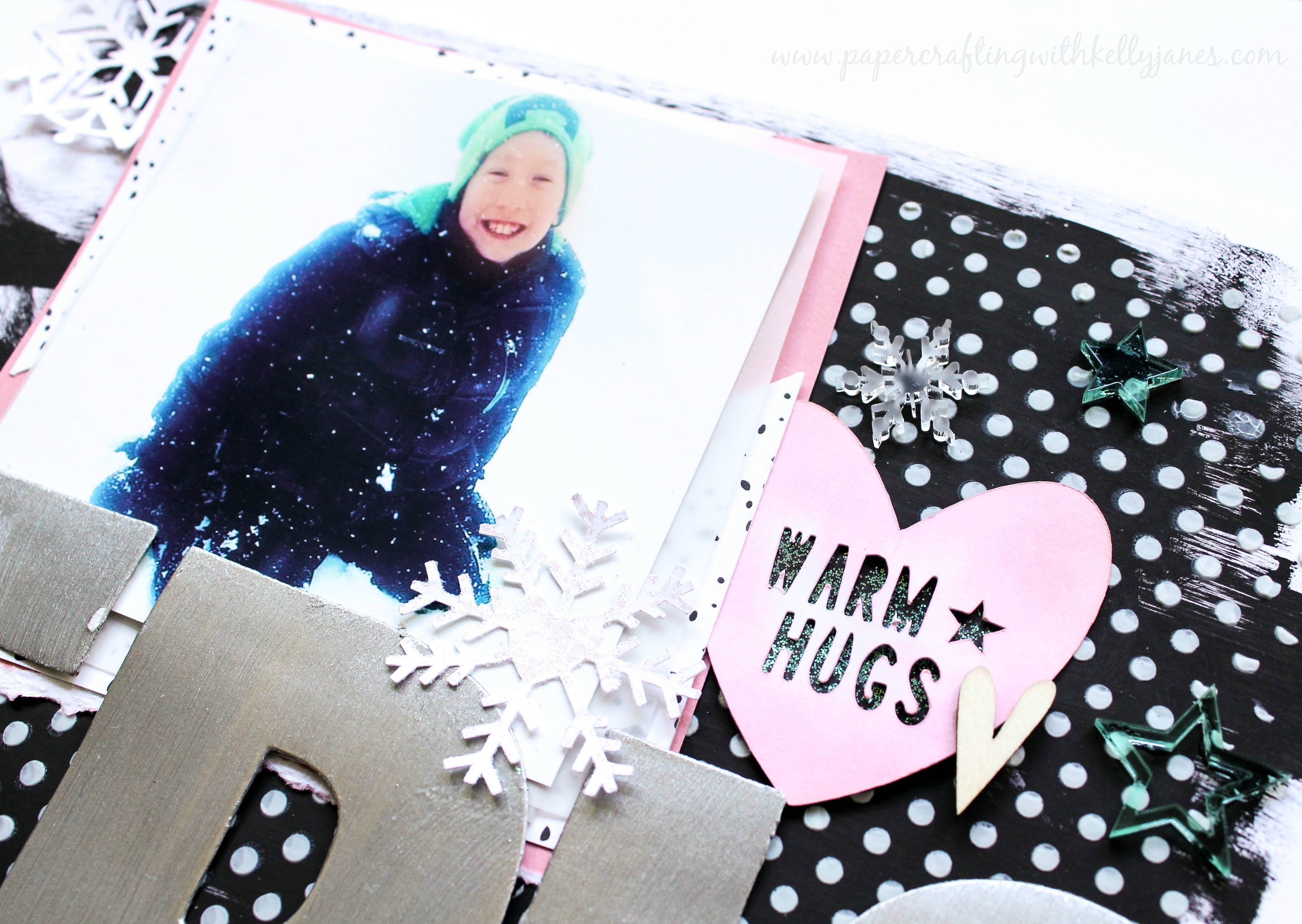 The bottom right hand corner has a couple Heidi Swapp Minc chipboard ephemera pieces and I also added a strip of Amy Tan washi to ground my photos at the bottom of the page. I finished off the layout by adding Amy Tan heart enamel dots and a few sequins scattered about. I added my journaling, date stamp and the layout was finished!