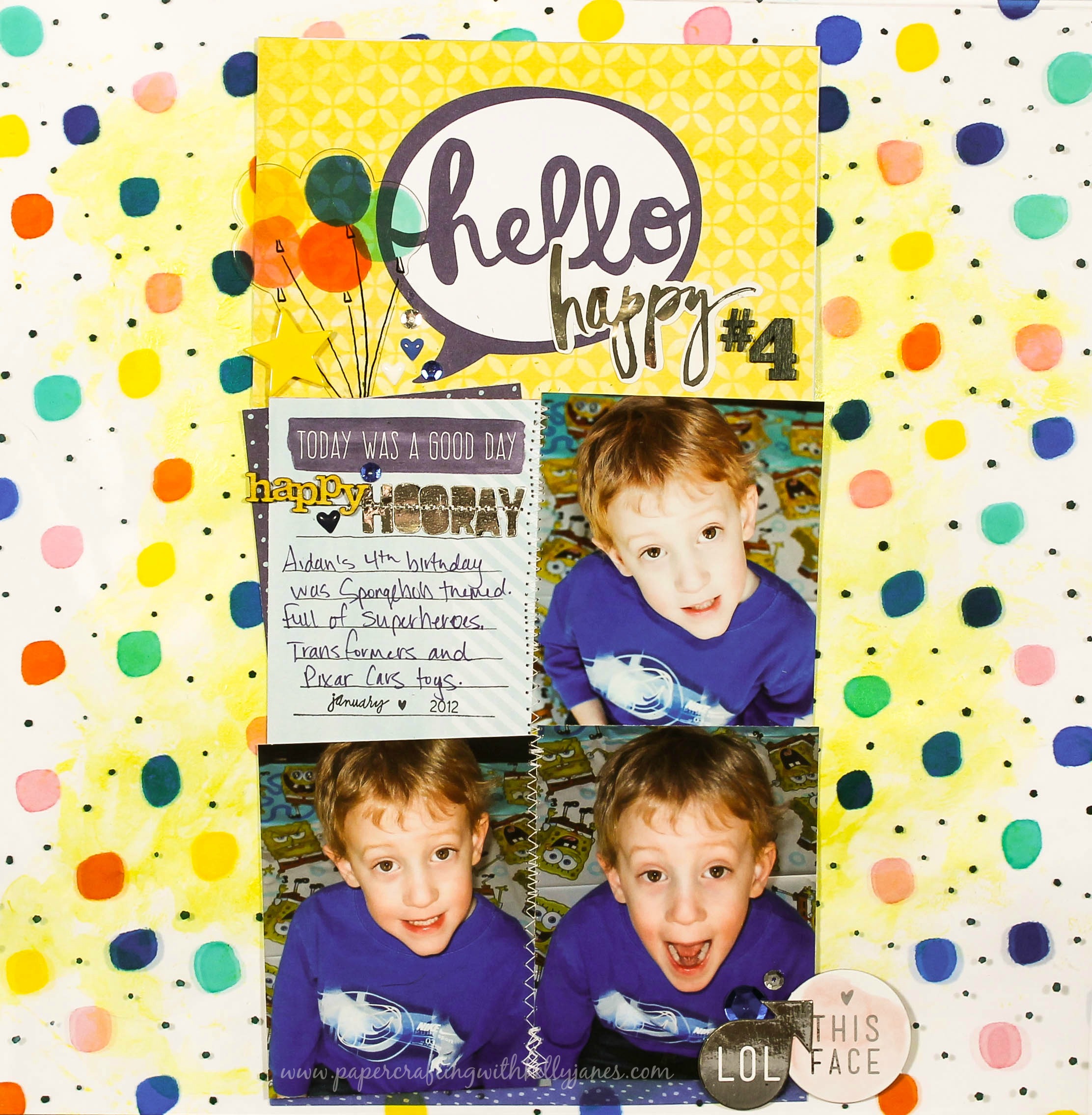 I started by adding Shimmerz Lemon Drop Dazzlerz to the White Daisy Cardstock background that I prepped with clear gesso. Once the Dazzlerz was dry I added the polka dot acetate sheet from Amy Tan’s Finders Keepers line. I grabbed a few pieces from the cut apart sheet of Amy Tan’s Better Together line and arranged a vertical design straight down the center of the page. The photos I chose for this layout are of my son at his 4th birthday party and I loved the bright bold colors of the Amy Tan lines.