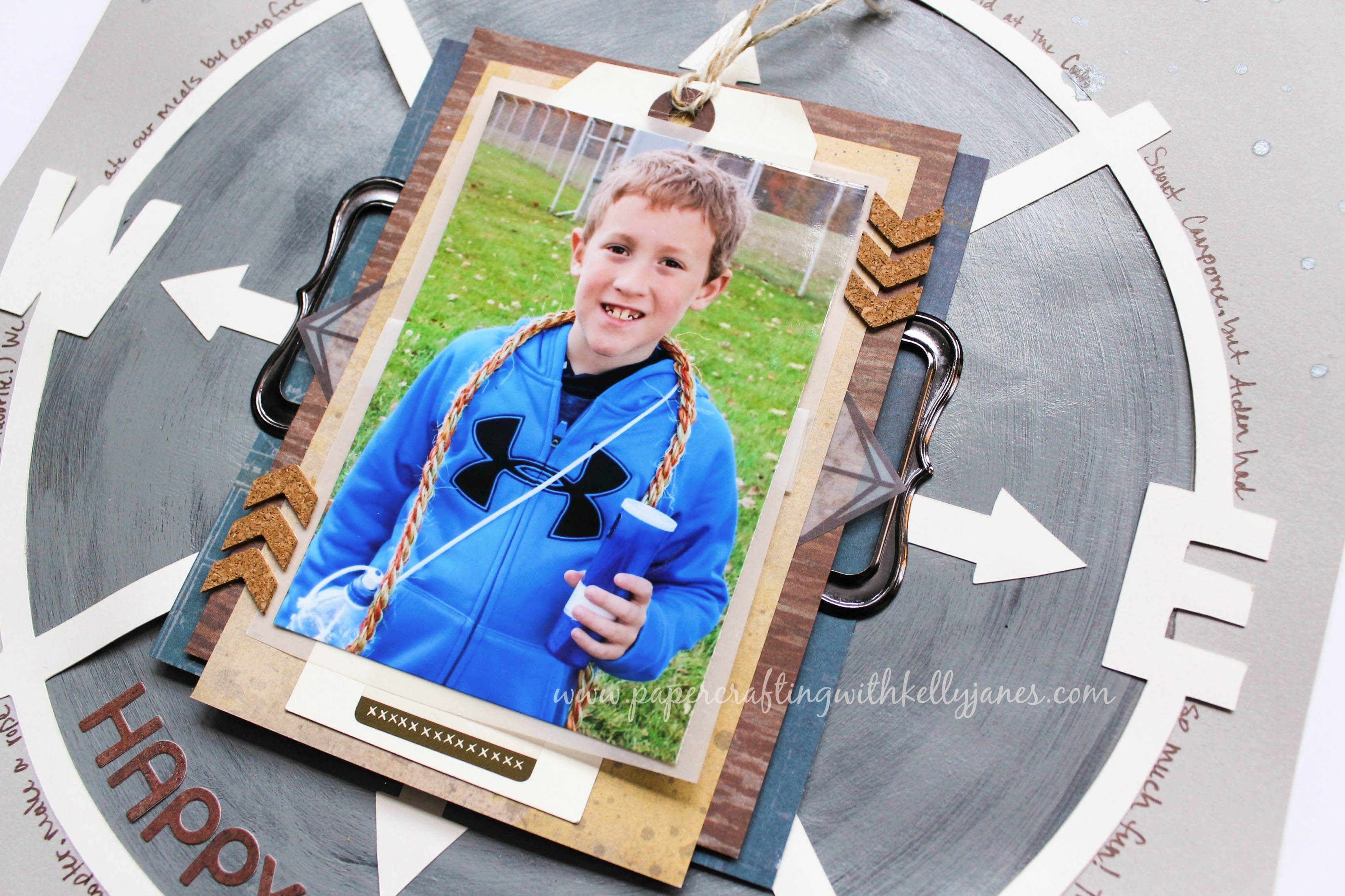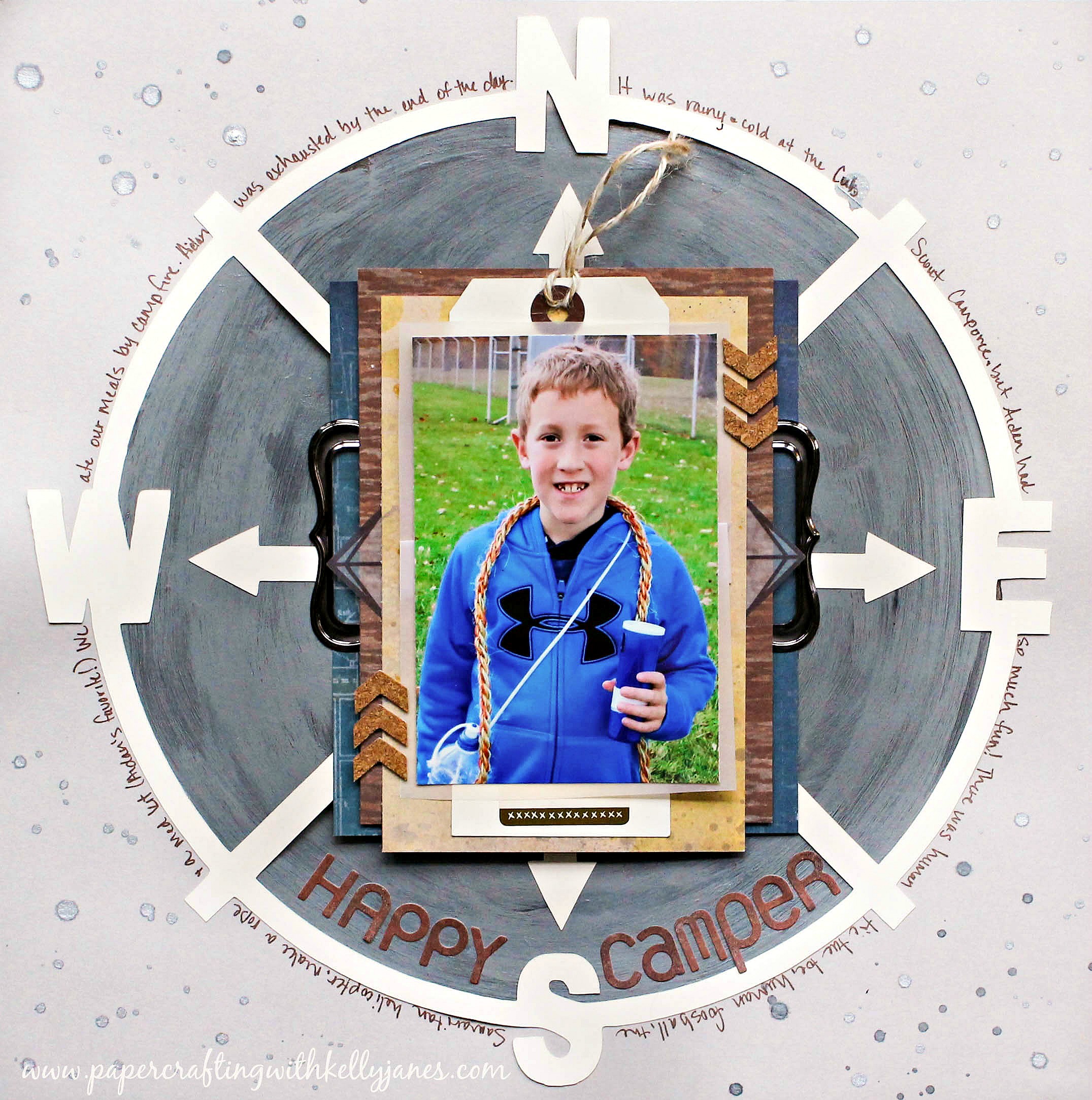 I recently shared this layout featuring photos from my son’s Cub Scout Camporee. I included 13 photos in that layout so I didn’t have a lot of room for journaling. I created a second layout featuring a large photo and journaling on his favorite activities and all the fun things we did that day.