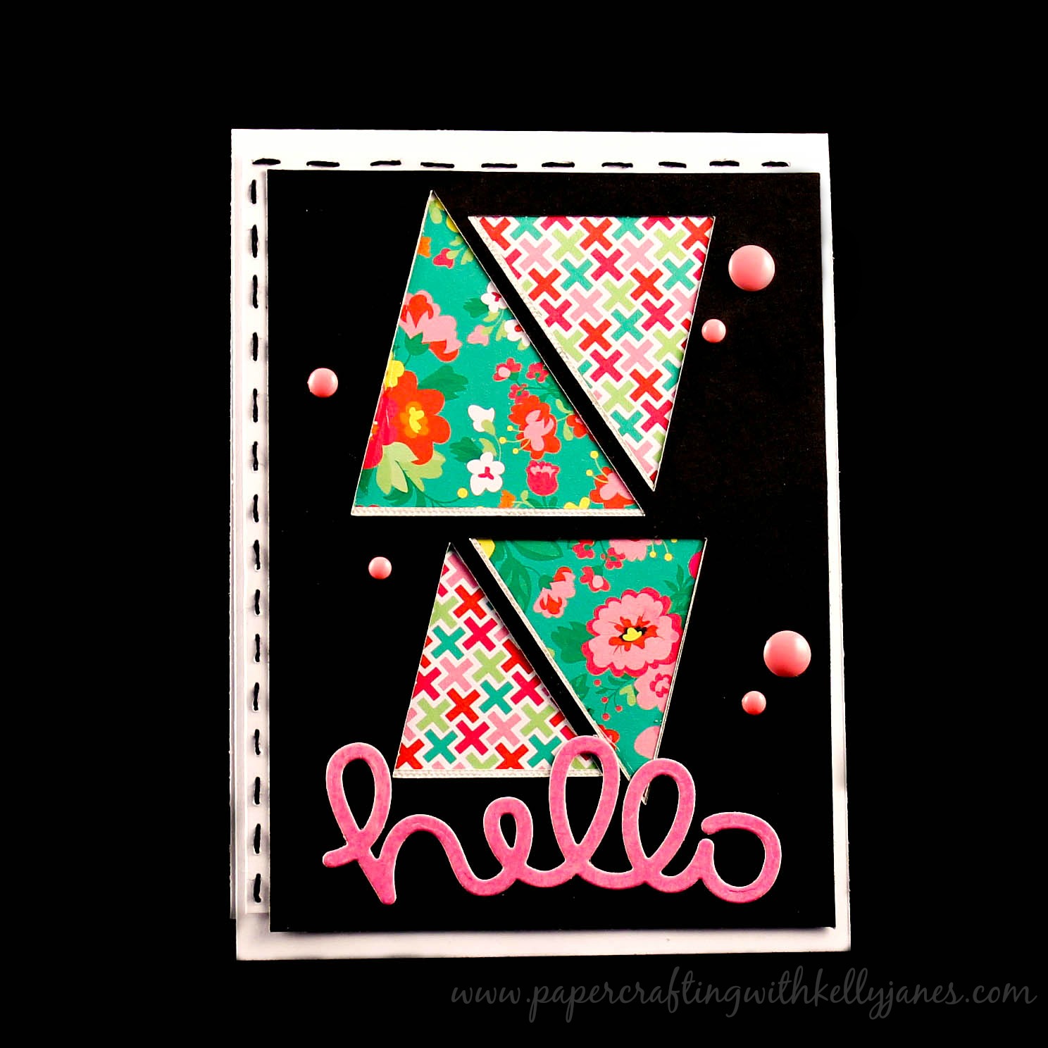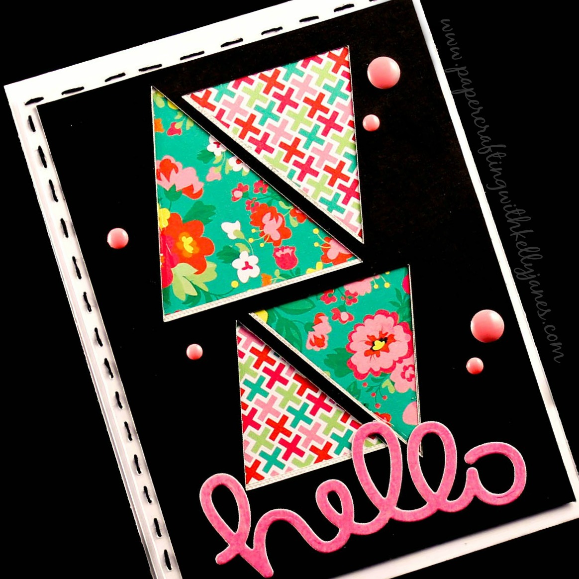 Now at this point I placed the black panel on the white card base and it was missing something. So I added another piece of white cardstock and just had it peek out from the top and left of the black panel. I had intended on using my sewing machine to stitch the panel but I am currently out of black thread. So I grabbed my embroidery floss and hand stitched along the edge. The sentiment comes from a Freckled Fawn die and a scrap piece of pink paper I had in my stash. I then added a few Pink Flamingo Dots for the final touches.