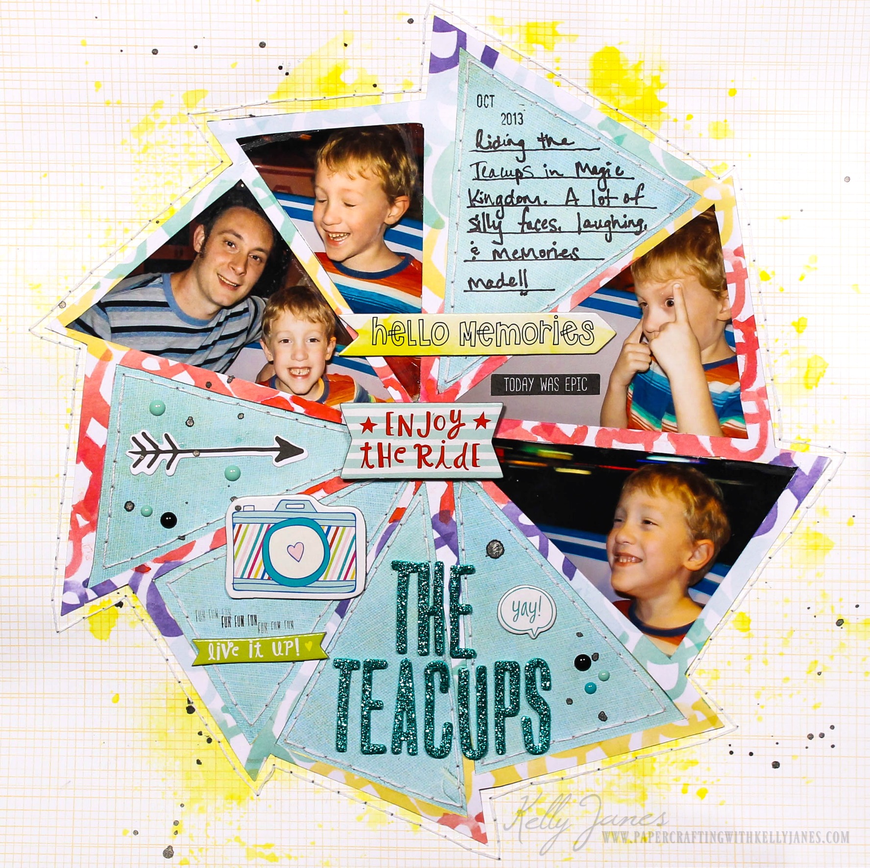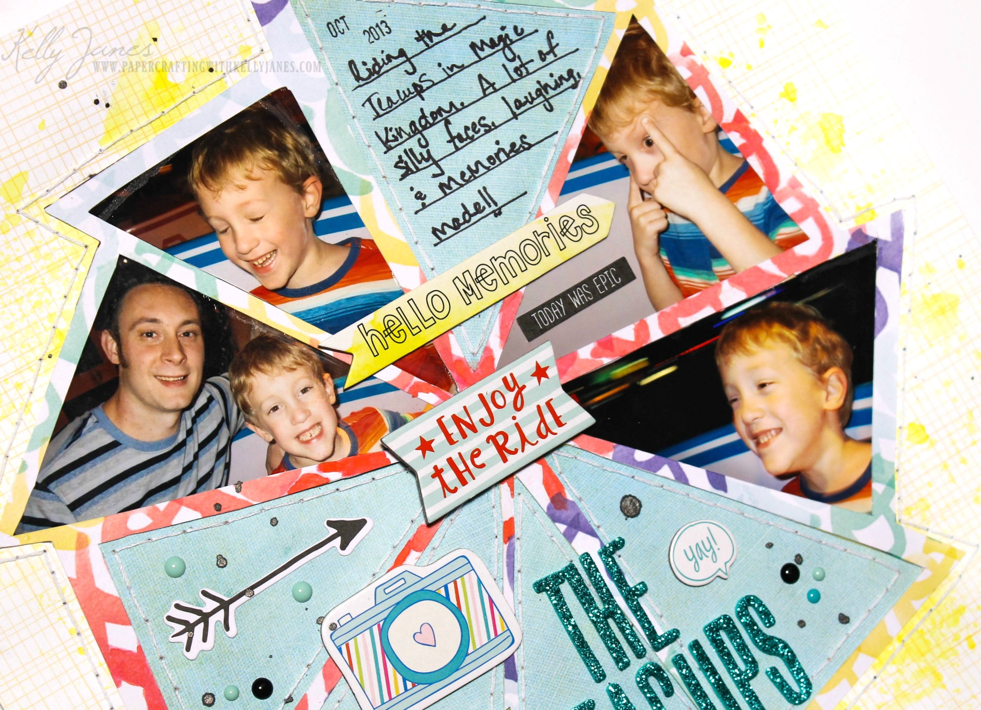 I used the free Camp Glamp Cut File from Scrapbook Nerd that was designed by The Cut Shoppe. I just recently had these photos printed from our 2013 Disney trip and when I was sorting them I literally laughed out loud at the facial expressions that my son was making while we were on the Teacups. I’m still laughing now just thinking about them! I knew I couldn’t choose just one photo and wanted to use them all. They were all printed at 4×6 and a couple of them were a little fuzzy because of the motion of the Teacup ride. I didn’t want to reprint them to a smaller size but I knew if I didn’t find a way to shrink down the size of the photos I would never fit them on one layout. That’s when I spied this cut file! PERFECT!