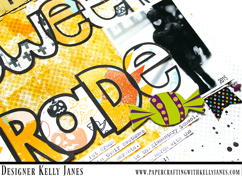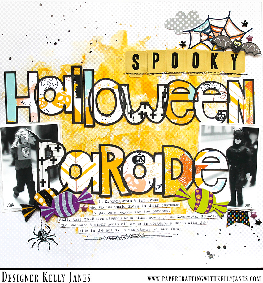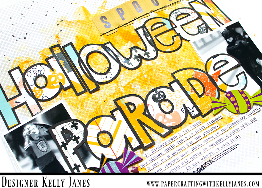 After the mixed media was dry I moved on to my title. I used the Open Letter Alpha Cut File from The Cut Shoppe to create the title, Halloween Parade. I used a variety of patterned papers from the 8×8 Goosebumps Patterned Paper Pack, including part of the packaging, to back the letters of the cut file. I grabbed my two photos, added a layer of tissue paper, and tucked the photos behind the word Parade. The photos I used for my layout are from a Halloween Parade that my son’s primary school put on each year for the parents. Sadly this fun event ended when he graduated from the primary school and moved into the elementary school. The photos are a little blurry because he was in motion, but I wanted to document the memories nevertheless.