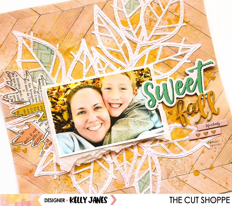 After the mixed media was dry, I adhered the cut files to the background and added hand stitching to the leaves using white embroidery floss. I added a few layers of tissue paper behind my photo and raised the photo from the background using fun foam. I then added the title to the page using the word “Sweet” from the Maggie Holmes Gather Chipboard Thickers Sheet and the word “Fall” using the gold foam Hazel Thickers from the One Canoe Two Hazelwood Collection. I grabbed a couple small chipboard pieces from the same Maggie Holmes Chipboard Sheet and adhered them as accents under the title.