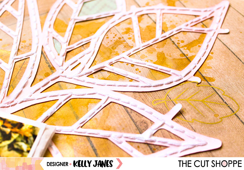 I started in Cricut Design Space by slicing out the large open leaf cut file image. I duplicated and cut the image numerous times on a piece of White Cardstock. I then painted those cut file images with Shimmerz Paints Great Fruit Creameez and backed a few of the open areas using a green patterned paper from the Maggie Holmes Gather 6×6 Paper Pad and vellum.