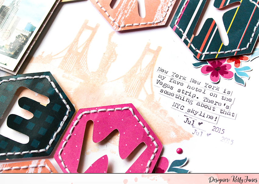The New York Stamp Set was the inspiration for my first project. I started with multiple patterns from the Pastel Dreams Paper Pad for my first layout. I wanted to use as many patterns as possible so I used a cut file from The Cut Shoppe to spell out my title, New York New York. I added hand stitching detail to each of the pattern papers. I positioned the letters on the top and bottom of the layout; leaving an open space in the middle of the layout.