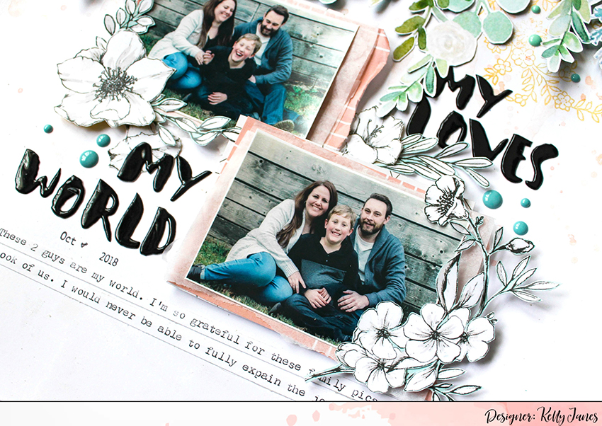 I fussy cut the hanging florals from 2 of the matching papers from the paper pad and positioned the florals at the top of the 12×12 white cardstock background. I added a wash of light peach watercolor under the florals and allowed the color to run down the page. I also stamped the Flower Vine Stamp Set in that same area. I love the hints of gold peeking out from behind those beautiful fussy cut florals!